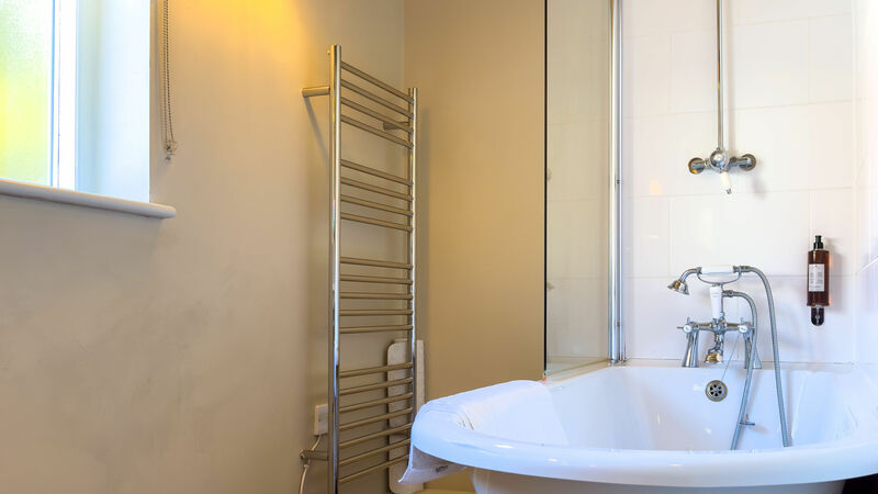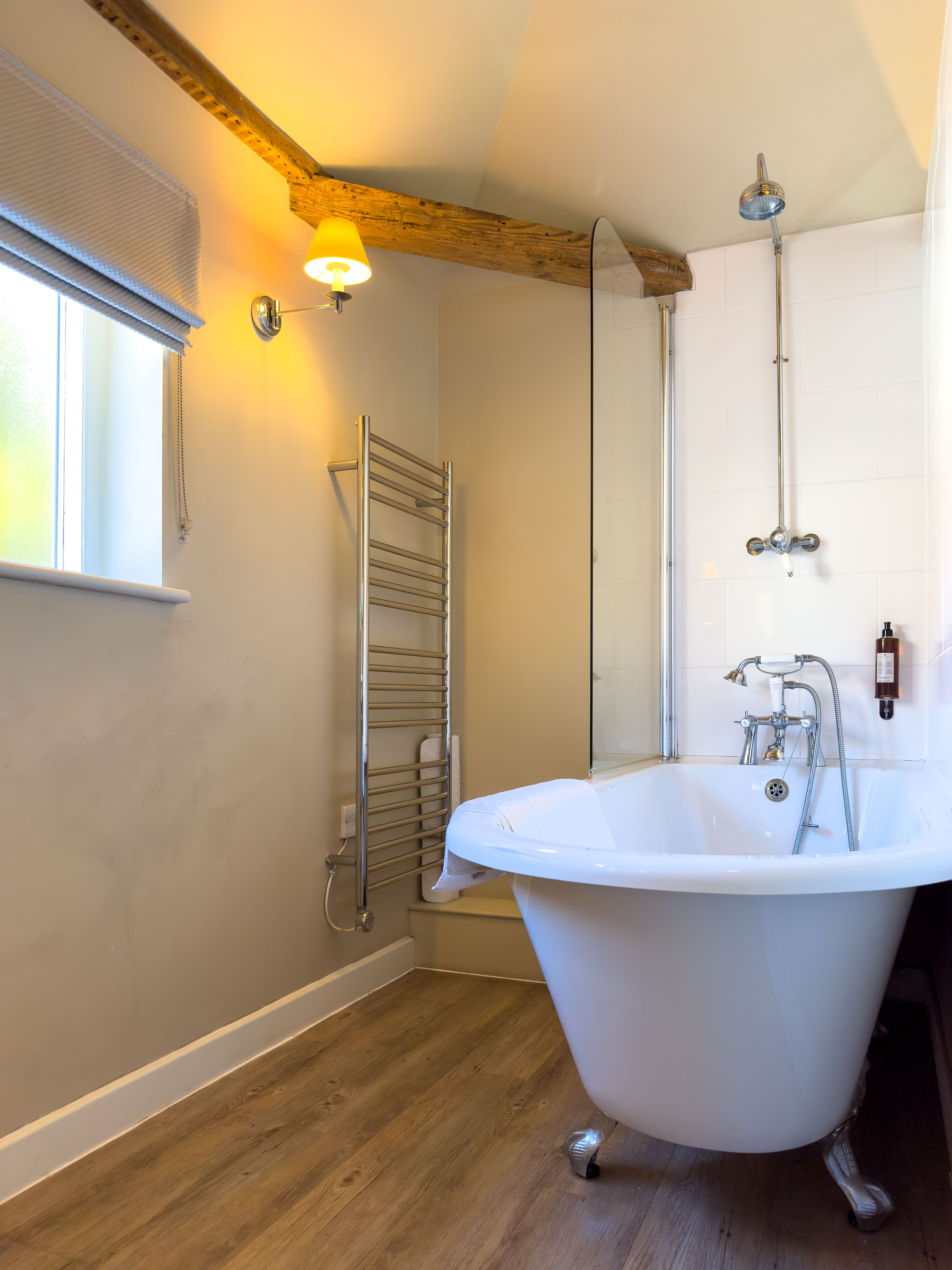 Roll top bath with shower over